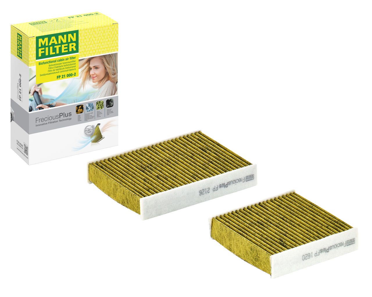 Biofunctional MANN-FILTER FreciousPlus cabin air filters - nearly 100% protection against nitrogen oxides, dust, allergens and mould - harmful gases and unpleasant odours are also eliminated and virus aerosols filtered. The three-layer filter technology absorbs almost 100% of allergens, reduces the growth of molds and bacteria by more than 98% and stops fine dust almost completely.Specification