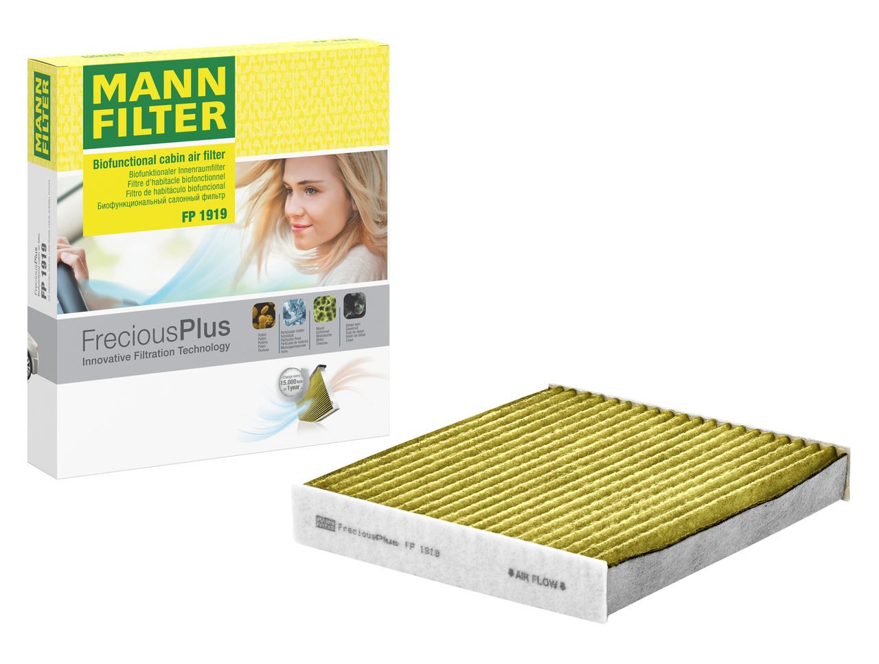 Biofunctional MANN-FILTER FreciousPlus cabin air filters - nearly 100% protection against nitrogen oxides, dust, allergens and mould - harmful gases and unpleasant odours are also eliminated and virus aerosols filtered. The three-layer filter technology absorbs almost 100% of allergens, reduces the growth of molds and bacteria by more than 98% and stops fine dust almost completely.Specification