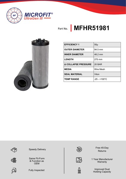 Genuine MicroFit® UltraGen III MFHR51981 filter. Engineered and manufactured in Great Britain the MFHR51981 is designed to meet or exceed the quality and performance of OEM quality standards, ensuring superior filtration performance and the longest possible filter life.Building on over 50 years of filtration expertise, the UltraGen III series is the third generation of MicroFit® filter media, delivering exceptional efficiency and reliability.
