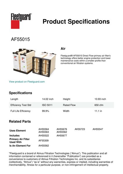 Fleetguard® AF55015 Direct Flow primary air filter's technology offers better engine protection and lower maintenance costs within a smaller profile than conventional air filtration systems.Specification