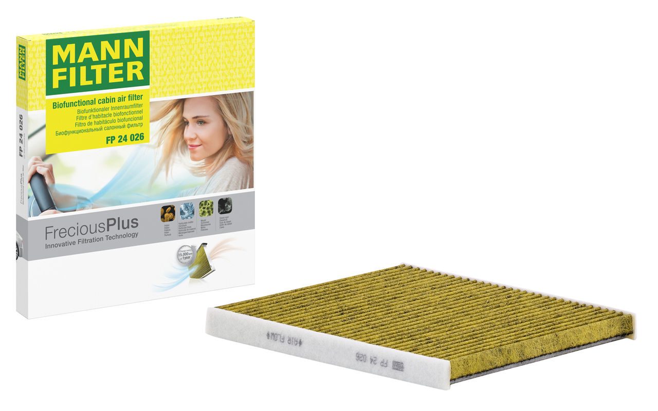 Biofunctional MANN-FILTER FreciousPlus cabin air filters - nearly 100% protection against nitrogen oxides, dust, allergens and mould - harmful gases and unpleasant odours are also eliminated and virus aerosols filtered. The three-layer filter technology absorbs almost 100% of allergens, reduces the growth of molds and bacteria by more than 98% and stops fine dust almost completely.Specification