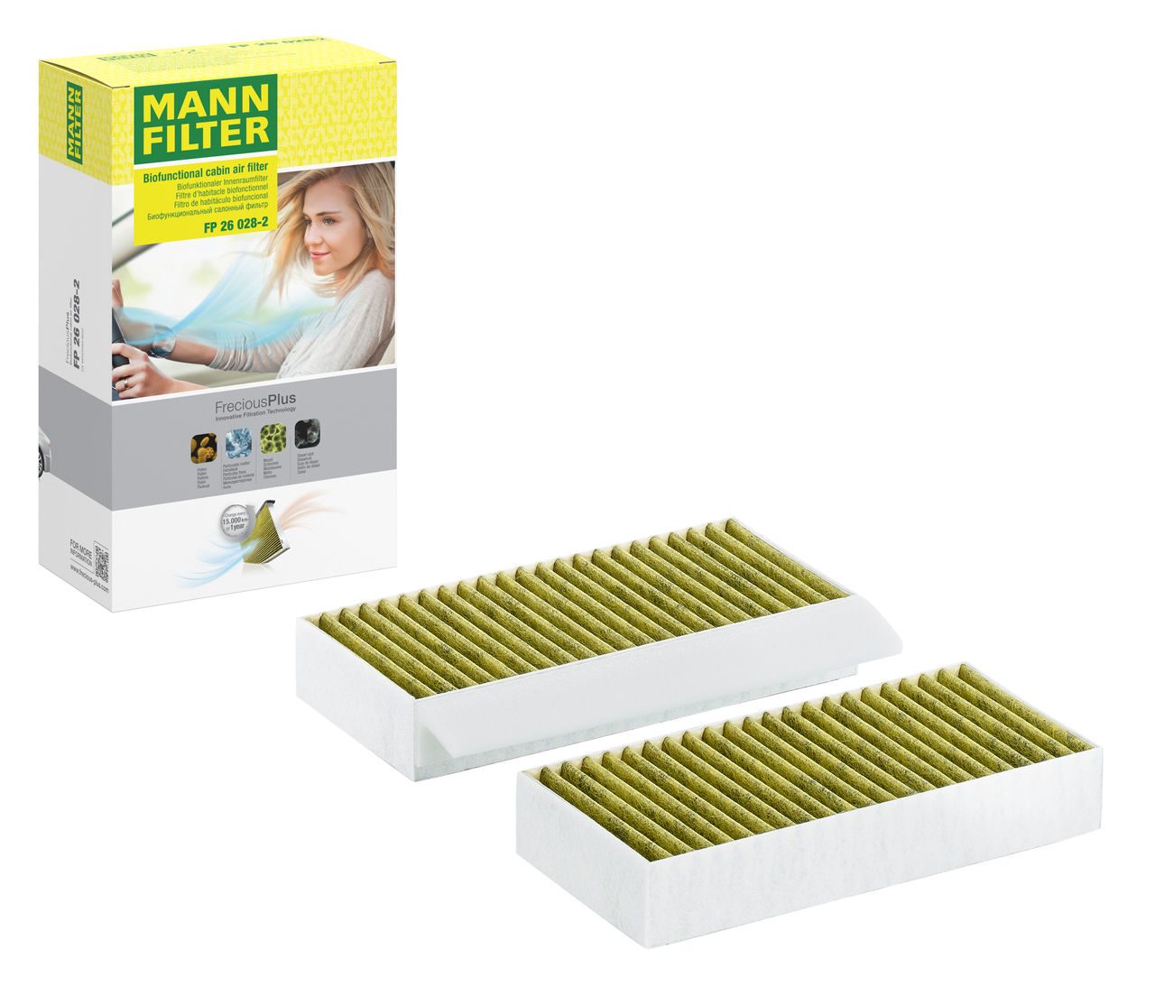 Biofunctional MANN-FILTER FreciousPlus cabin air filters - nearly 100% protection against nitrogen oxides, dust, allergens and mould - harmful gases and unpleasant odours are also eliminated and virus aerosols filtered. The three-layer filter technology absorbs almost 100% of allergens, reduces the growth of molds and bacteria by more than 98% and stops fine dust almost completely.Specification