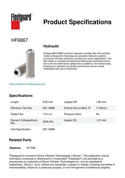Fleetguard® HF6867 premium hydraulic cartridge filter with synthetic media is designed to help keep your precision hydraulic systems running as intended, providing a solution for various applications. This filter meets or exceeds the equipment OEM quality and performance and is the first aftermarket replacement available on the market today, bringing your operation top-quality performance and an overall unbeatable total cost of ownership.Specification