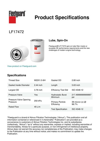 Fleetguard® LF17472 spin-on lube filter meets or exceeds OE performance requirements and the new challenges of modern engine technology.Specification