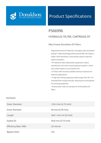 Genuine Donaldson P566996 Hydraulic Filter, Cartridge Dt is engineered with advanced depth filtration technology, offering enhanced dirt retention and fluid cleanliness. It ensures optimal performance in high-pressure hydraulic systems, effectively protecting critical components from wear and extending system life.This filters robust construction and superior filtration efficiency make it ideal for demanding applications. Its reliable performance helps minimize maintenance costs and system downtime, ensuring consistent operation under tough conditions.