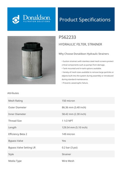 Genuine Donaldson P562233 Hydraulic Filter, Strainer is designed to capture larger contaminants before they enter the hydraulic system, protecting sensitive components from damage. Its coarse filtration capability helps extend the life of downstream filters and improves overall system performance.