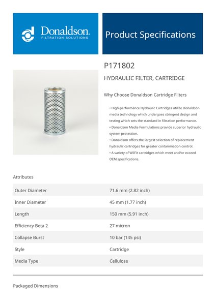 Genuine Donaldson P171802 Hydraulic Filter, Cartridge is designed to provide superior protection for your hydraulic system, effectively capturing contaminants to ensure clean fluid circulation. With high-quality filtration media, it extends equipment life, improves operational efficiency, and maintains fluid cleanliness even in the most demanding environments.